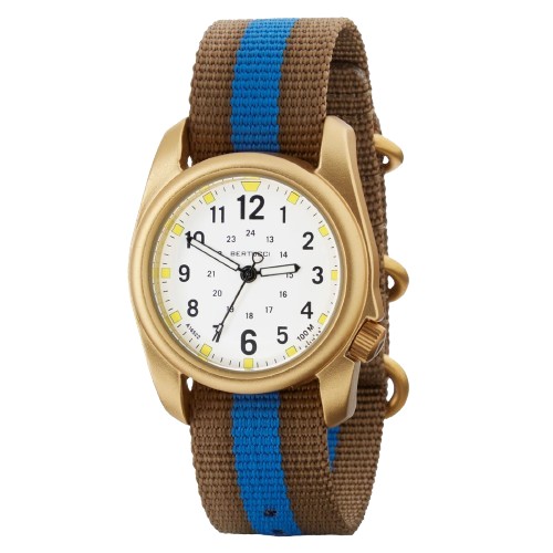 The A-2A Golden Field innovative design brings together durability and comfort in a dress look. It features Bertucci's legendary A-2 U.S. Patented Unibody 40 mm case in non-reflective anodized gold tone aluminum. The versatile Golden Field requisite field ready features include: Easy to read functional dial w/ 12/24 hour markings, 100M water resistant, rugged B-Type Gold Line Nylon band, 4 year battery, accurate and long lasting gold plated all-metal movement, Swiss super luminous hands and markers, and scratch resistant R-Type mineral glass crystal.