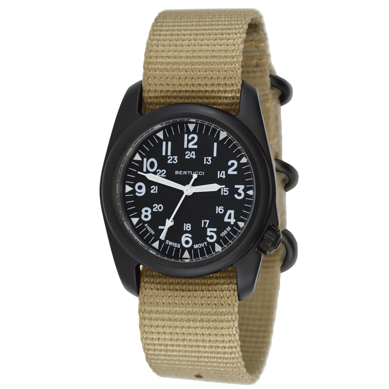 The A-2S Vintage Black dial is painstakingly authentic and functional. Utilizing Bertucci's legendary U.S. Patented Unibody 40 mm A-2 case for unmatched comfort and durability. Equipped with a highly reliable Swiss movement, a scratch resistant R-Type crystal, 100M water resistance, Swiss super luminous hands & markers, rugged screw down crown & back, and the long lasting B-Type nylon webbing band.