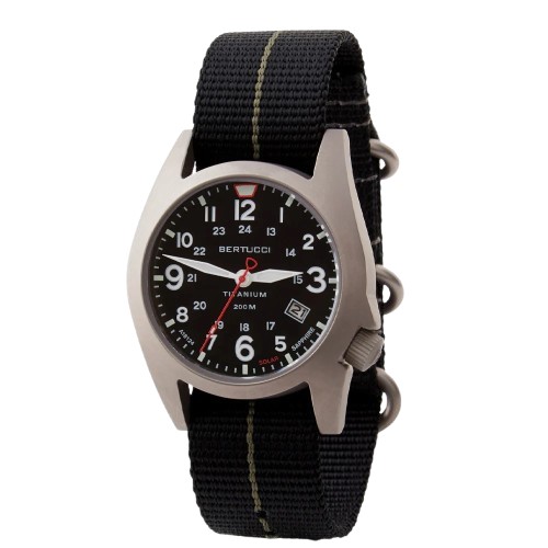 The Bertucci A-7TS RETROSPEC Solar field watch features a solid titanium U.S. Patented Unibody 41 mm case that is a clean functional design with a retro feel. It is equipped with a precision solar powered all-metal movement that has 6 month power reserve, excellent accuracy and reliability... and requires no battery changing or charging. The brushed finish titanium case offers excellent durability and lightweight comfort. The functional high contrast dial is easy to read and offers 12-24 hour time w/ date. Also, equipped with a scratch resistant R-Type sapphire crystal, rugged screw down crown and back, Active Comfort band, Swiss super luminous hands and markers, and 200 M water resistance.