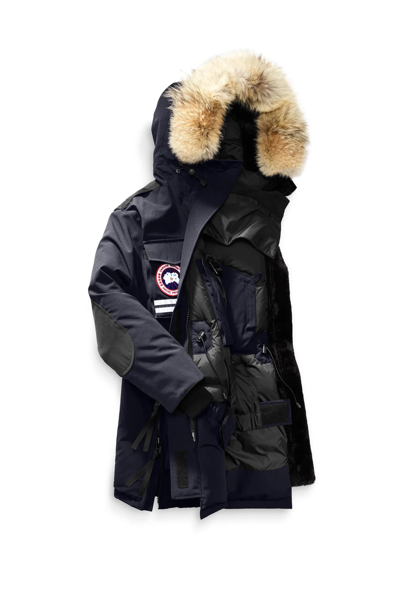 - Removable coyote fur ruff surrounding a 3-way adjustable tunnel hood (vertically, horizontally and hood opening), with an adjustable bracing wire for superior protection in high-wind conditions