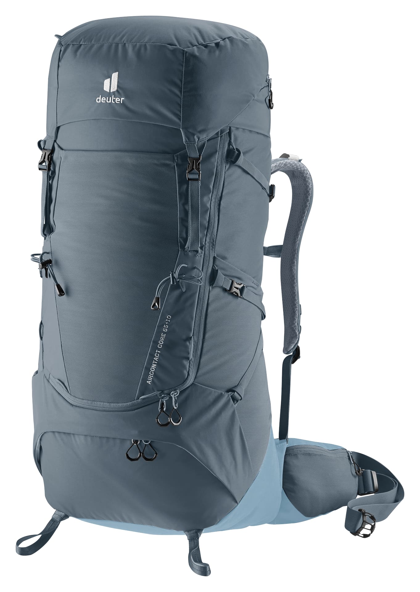 Its superior carry comfort is down to the deuter Aircontact back system with Air Spacer mesh and a large ventilation channel, plus ergonomic ActiveFit shoulder straps and an adjustable sternum strap. The Y-shaped frame, mobile hip fins and ergonomic lumbar pad combine to distribute the load effectively. A full-length, J-shaped zipper on the front makes contents easy to locate lower down in the main compartment. Hip fin pockets provide easy storage and keep items within reach. Stretch mesh side pockets keep bottles close at hand for hot days on the trail.