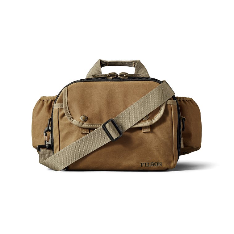 A lightweight, water-repellent waist pack with divided storage, cotton webbing for zingers and a sheepskin shearling patch for flies. The waist strap extends to 48 inches with rustproof, easy-buckle closure. Grommets built into the bottom allow drainage.