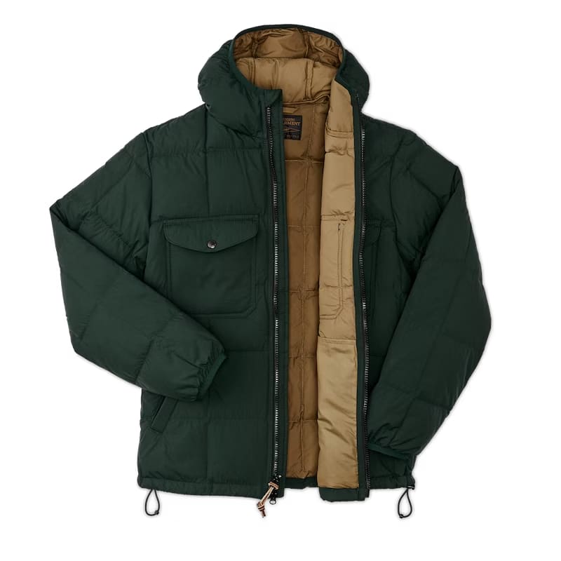 The Pateros Down Jacket provides warmth with minimal weight. The ultralight shell is filled with responsibly-sourced goose down, natures warmest and lightest insulation. Downs natural compressibility allows packing into very tight spaces in a pack or duffle. The snaps for the chest pocket flaps are mounted on fabric loops for one-handed operation, and the handwarmer pockets are lined with Filson's signature Alaskan Guide flannel for added warmth. Elastic cuffs and hood binding. Drawcord-adjustable hem.