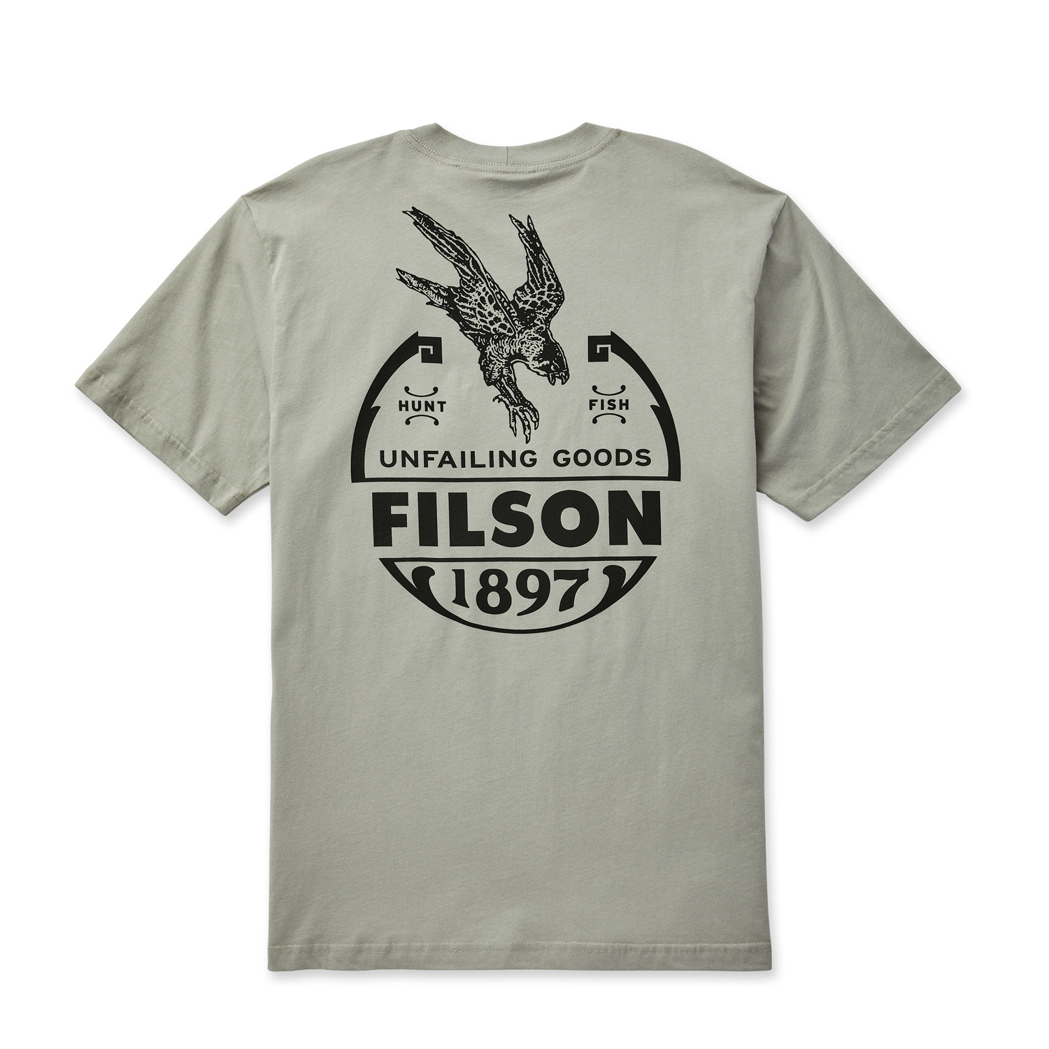 Filsons Lightweight Outfitter Short Sleeve Graphic T-shirt is made in the USA with, breathable 3.5-oz. cotton with a rib-knit collar, ready for heavy use.