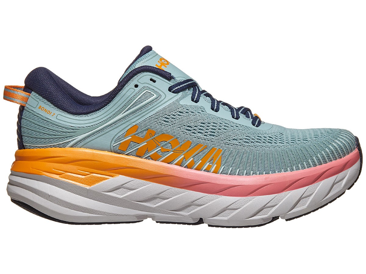The most cushioned shoe in the HOKA road-shoe lineup, the game-changing Bondi 7 delivers a smooth, balanced ride over any distance. Engineered with the same full EVA midsole, breathable mesh upper and signature Meta-Rocker technology as its predecessor, the Bondi 7 is updated with a supremely plush collar. Made from ultra-soft memory foam designed to accommodate a narrower heel, the collar conforms to a wide variety of ankles, cradling the Achilles in cushy comfort. Unquestionably, the Bondi 7 will take you far and wide.