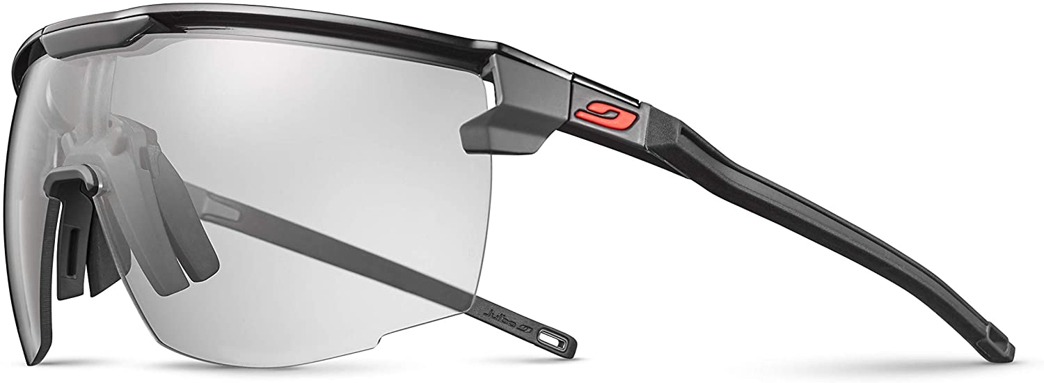Julbo pushes the limits of performance with the tapered outline of its ULTIMATE sunglasses model. Each line and detail of this model's geometry are designed to serve one goal only: to give you ultimate freedom in your sport. New CustomFIT temples with precise and long-lasting adjustment, combined with a Grip Tech structure, produce a tailor-made grip and a lightweight spec. Fitted with a 3D Nose, the sunglasses offer flawless hold when you're working flat out, with or without a helmet. A panoramic lens creates an aggressive look while giving you protection and visual comfort thanks to REACTIV Photochromic lenses. Now it's your turn to push the limits!