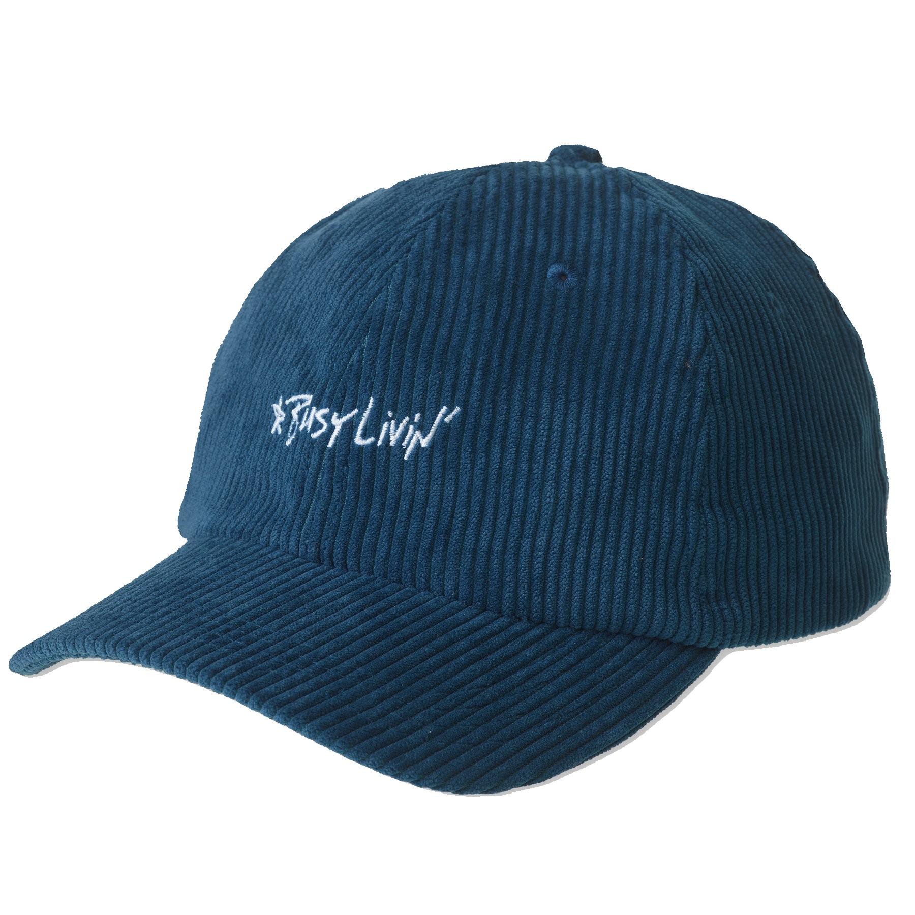 6 panel unstructured / low profile dad hat, raised embroidered logo on front, embroidered eyelets, curved bill, dark bronze metal tri glide buckle with self-fabric adjustable strap at back, interior taping and moisture absorbing sweatband.
