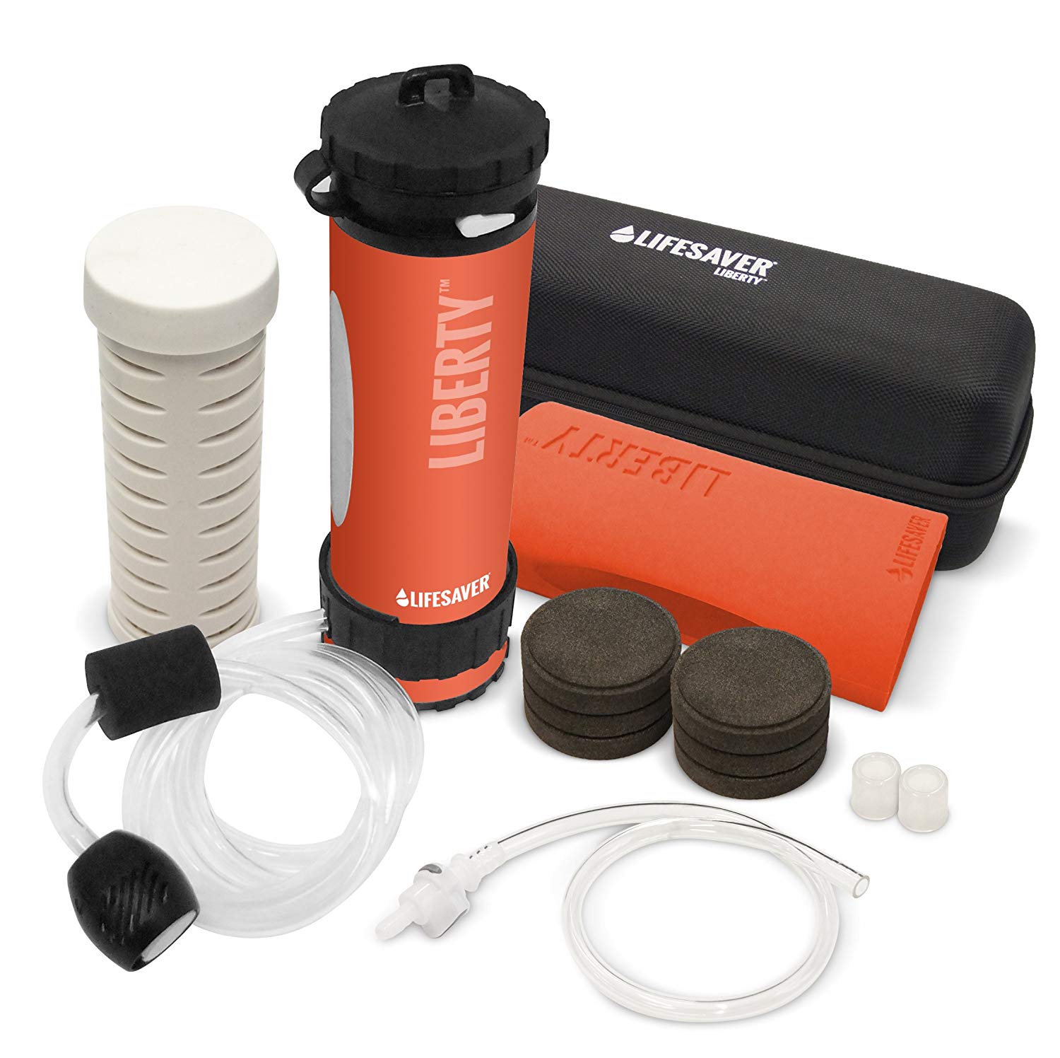 1x LifeSaver Liberty Bottle (including its 2,000L Cartridge, Activated Carbon Disc and 5ft Scavenger Hose), additional 6x Carbon Discs, 1x Protective Silicone Sleeve, 1x Replacement LifeSaver Liberty Cartridge, 1x LifeSaver Liberty EVA Travel Case, 1x LifeSaver Liberty Hydration Bladder Connector, and 2x Replacement LifeSaver Liberty Drinking Spouts.This pack saves you 15 percent on the items contained in this pack, as well as giving you everything you need to produce clean drinking water in the most demanding of outdoor environments.