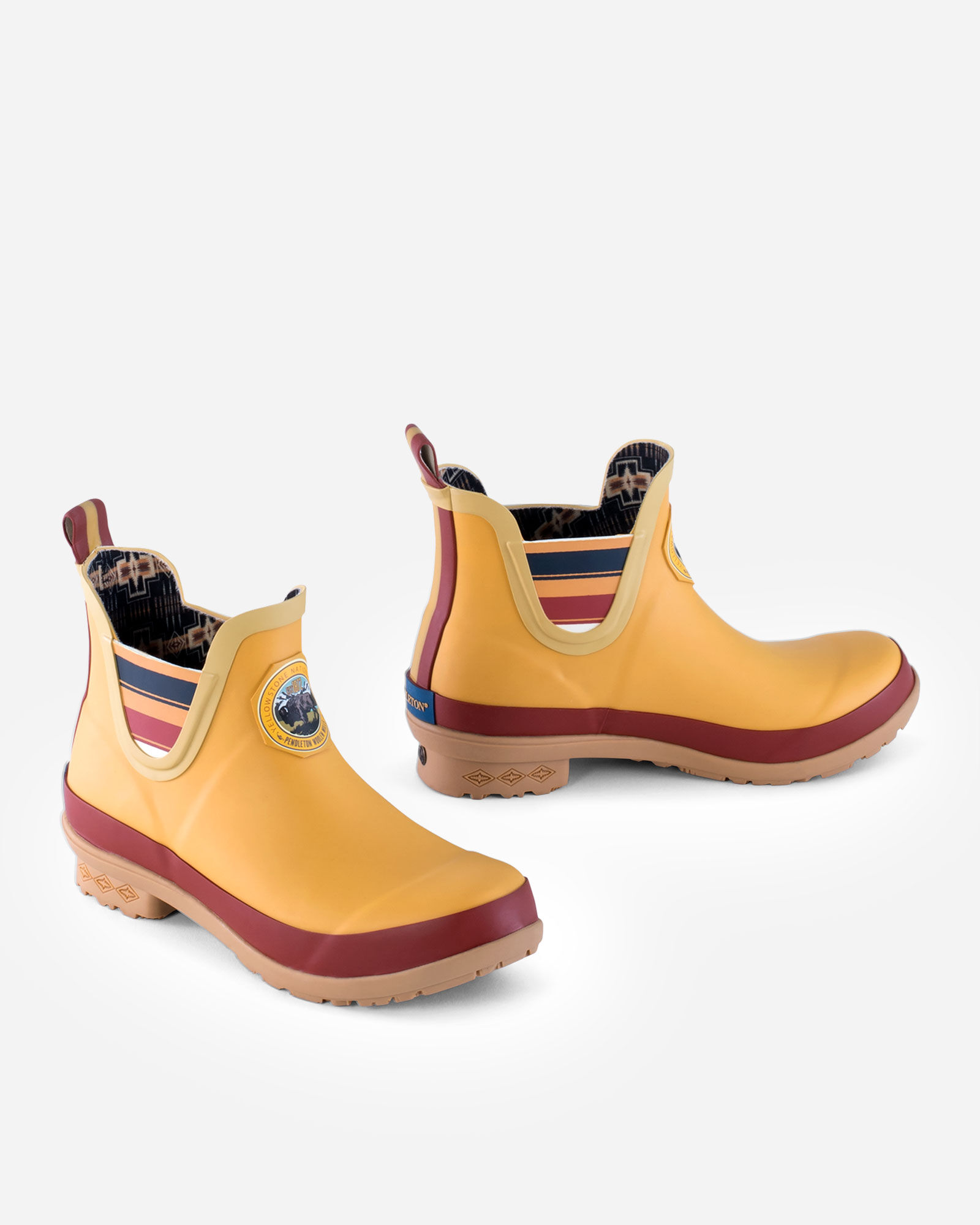 Puddle-proof rain boots showcase our beloved National Park stripes and vintage logo. Constructed of premium rubber with no-slip soles and exclusive Mountain Majesty tread. Cushioned insoles and internal shank system provide all-day comfort and support; pull-tab allows for easy on-and-off. Moisture-wicking linings feature our iconic Harding pattern.